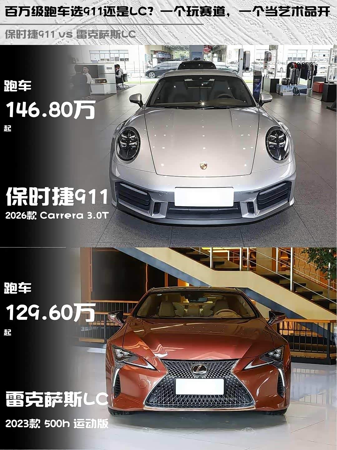 当 保时捷911(参数|询价)遇上雷克萨斯LC,百万级跑车怎么选才不后悔?🤔 今天带大家深度对比2026款保时捷911 Carrera 3.0T和2023款雷克萨斯LC 500h运动版,看完这篇你就懂了!