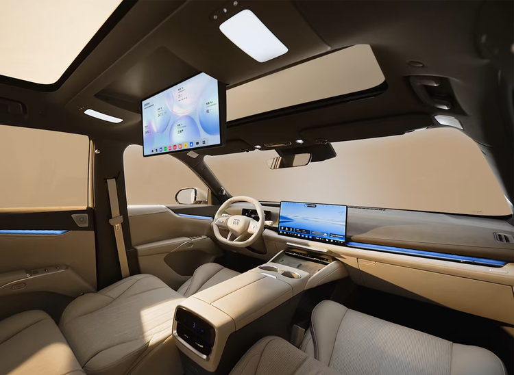 扶手箱内部配备有冷暖冰箱,车顶还配备有15.6英寸吸顶式后排娱乐屏,二排提供多功能桌板,多功能椅背拓展接口可灵活为设备供电,前风挡与四门均标配5mm双层夹胶静音玻璃,同时配备有后排隐私玻璃。