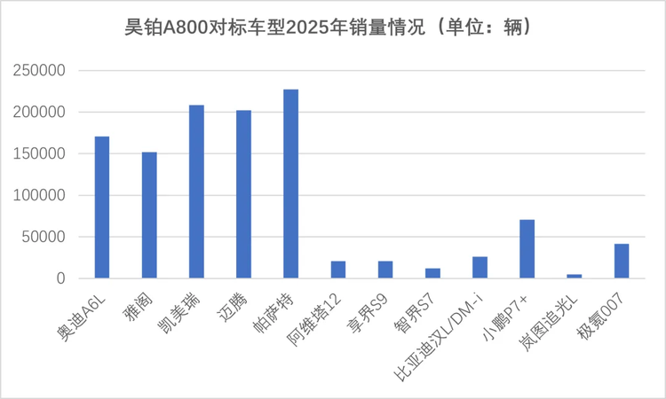2025年,这些竞品销量跨度极大,帕萨特等合资车仍保持20万辆级规模,新势力里以小米汽车销量最高,也是20万辆以上。