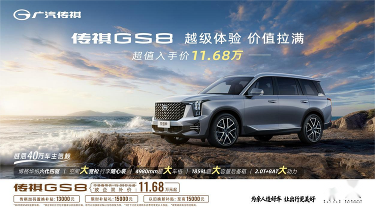 买它也没让我们增添太多负担。如今传祺GS8限时综合补贴至高43000元,入手低至11.68万元起。大空间、女皇躺椅、高安全、强保值,这些配置不是噱头,而是把“照顾她”这件事落到实处。