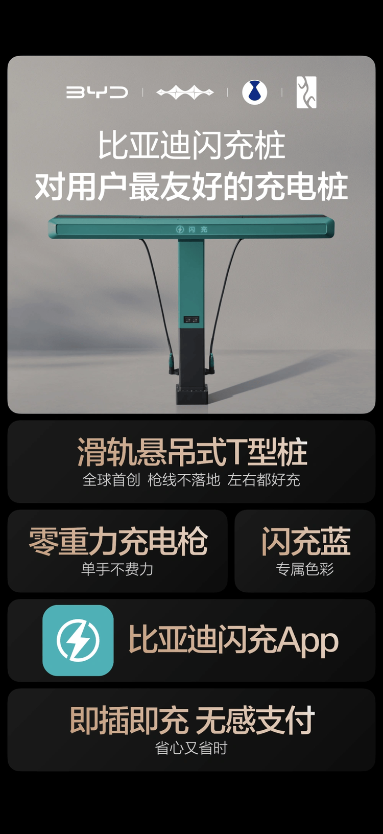 更值得关注的是,比亚迪在闪充桩的设计上,真正做到了“以用户为中心”,颠覆了传统公共充电桩的糟糕体验。传统公共桩的枪重、线脏、移动不便,以及繁琐的充电操作,让不少车主对公共补能望而却步,而比亚迪闪充桩采用全球首创的“滑轨悬吊式T型桩”设计,打造出“零重力充电枪”,取放轻松不费力,线缆悬吊永不拖地,从根源上解决了线脏的问题;滑轨设计则适配不同车型的充电口位置,左右侧均可轻松对接,再加上“即插即充、无感支付”的功能,用户全程无需动手操作手机,无需接触脏污线缆,补能过程流畅又省心,重新定义了公共充电的体验标准。
