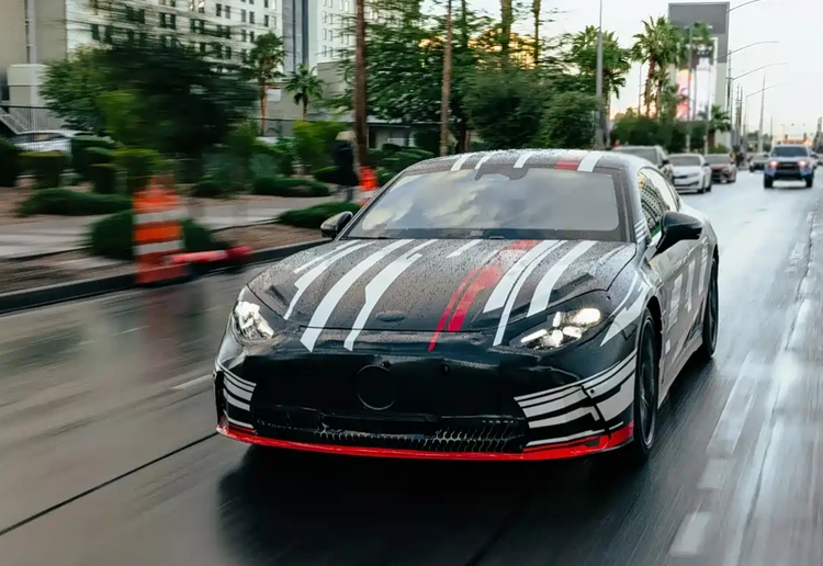 在车身的侧面,我们可以看到新车采用的是非常激进的风格打造,新车有一个大幅下沉的车顶设计,并且C柱大幅度的前倾,车窗倒是很渺小,展现出了较为运动化的一面。新车的侧面中间采用的是饱满的轮廓,它还有隐藏式的门把手的布局,车的底部采用的是简约化的包围。在动力方面,新车可能搭载单个400马力的三电机,功率估计轻松超千匹了,续航里程预计超过700公里。