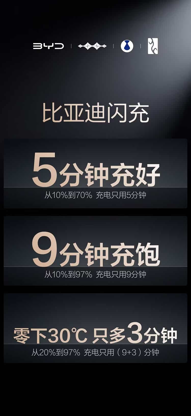 比亚迪是国内新能源市场的领跑者,与那些需要外采电池的车企不同,比亚迪早已实现了电池自研自产,甚至连丰田这样的汽车巨头,也选择采购比亚迪电池。3月5日,比亚迪发布了第二代刀片电池和闪充技术。与那些在发布会上各种宣布自己领先竞品百分之几的品牌不同,比亚迪只谈数据干货,“5分钟充好,9分钟充饱,零下30度只多3分钟”是比亚迪对车主的承诺。比亚迪也凭借硬核闪充技术树立行业新标杆。