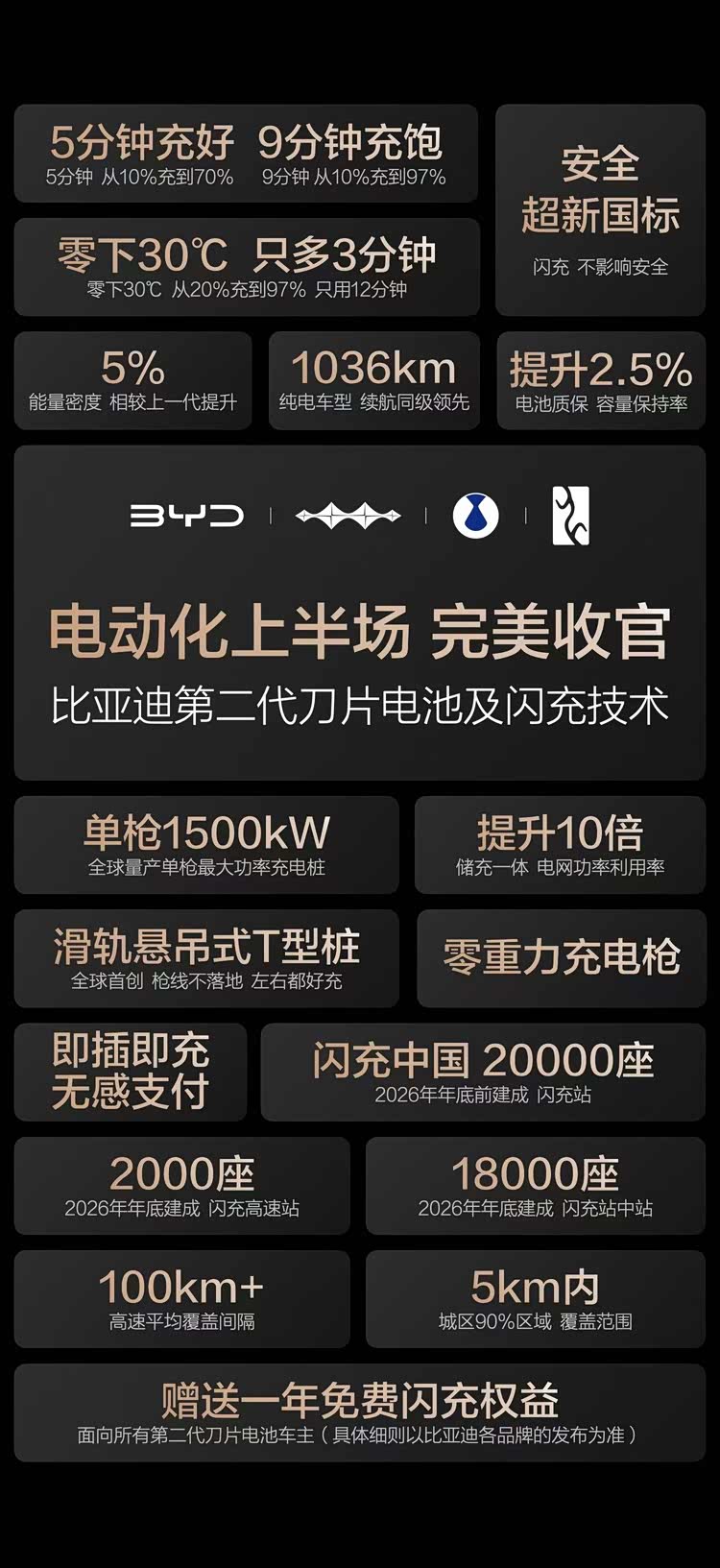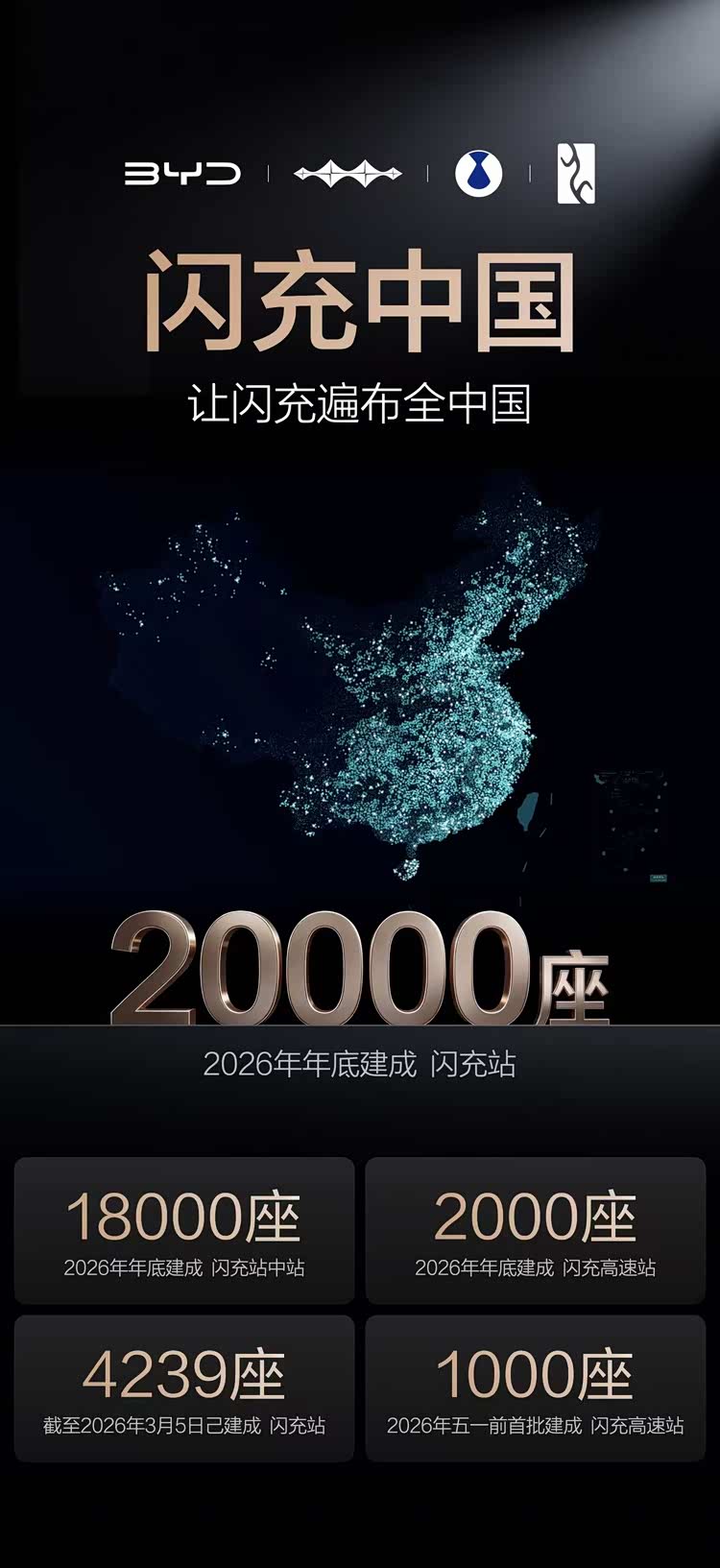 再好的技术如果不能走到每一个车主身边也是白搭。于是,比亚迪在发布闪充技术的同时,也开启“闪充中国”战略,在全国范围内大规模建设闪充站,预计到2026年底将落成20000座闪充站。其中,18000座“闪充站中站”将覆盖城区90%区域的5公里范围内,实现一二线城市3公里内、三四线城市5公里内、五六线城市6公里内就有闪充站;2000座“闪充高速站”还将覆盖近三分之一的高速公路服务区,实现每隔100多公里就有一座。按照计划,今年五一前,比亚迪将建成1000座“闪充高速站”。更诱人的是,比亚迪还宣布,将开启闪充用户“圆梦建站”计划:只要有4位比亚迪车主同时提出需求,且选址具备条件,就可以规划建站,并且闪充站将面向全社会开放共享。
