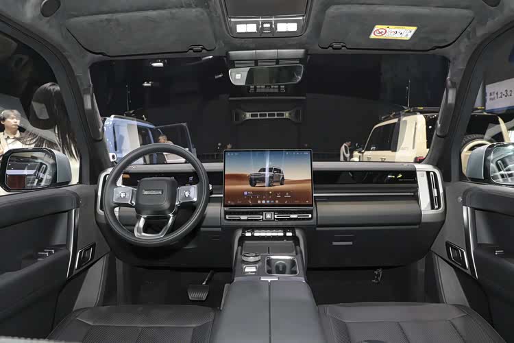 进入到车内,iCAR V27中控台处有着大量的笔直线条,使得内饰延续了外观硬朗的设计风格,车内采用了大量的皮质包裹,并提供了黑/棕、黑/紫、黑/灰以及全黑四种配色,像方向盘还采用了与内饰相同的配色,车顶也是用上了同色的翻毛皮材质,凸显了它豪华的一面。