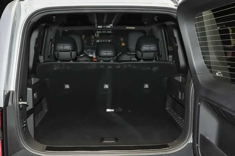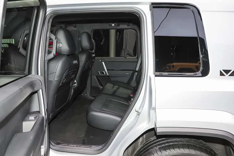 抛开全尺寸备胎对车身长度的加持,两车的实际尺寸还是比较接近的,在后备厢的两侧,iCAR V27也是配备了挂钩、网兜以及220V电源接口,不同的是,相比于方程豹钛7可以纯平放倒的第二排座椅,iCAR V27的后排座椅放倒后与后备厢地面会有一个高度差,后期想要当床车用需要先做找平处理。
