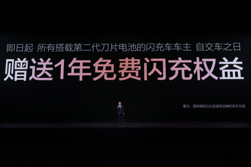 发布会现场,王传福还宣布:所有搭载第二代刀片电池的闪充车车主,均享有重磅“闪充权益”,自交车之日起,在全国闪充站可享受1年的免费闪充权益,让闪充体验更畅快。并且,在闪充免费期结束后,也会同行业保持一致,不会额外收费。