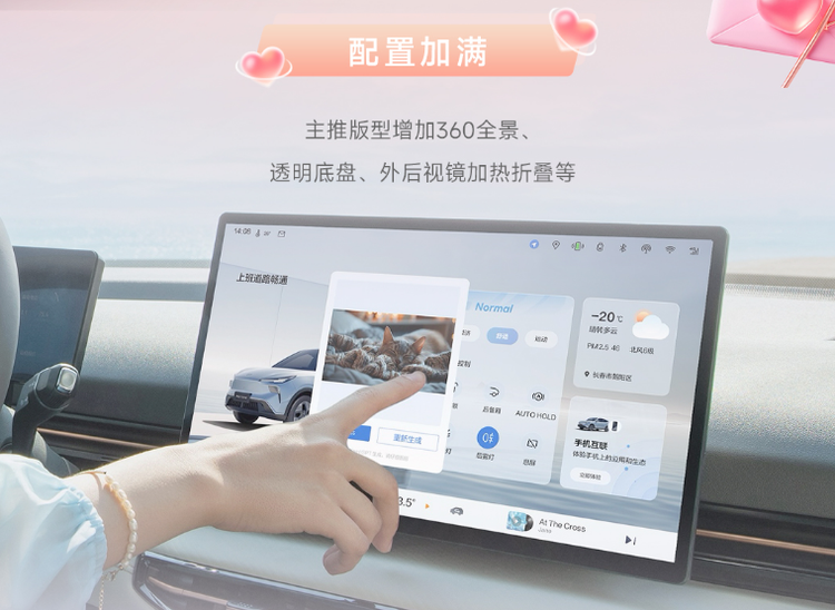 舒适满配,让家人惬意,也让她放松。全家出行,既怕孩子闹,又怕老人累。新车后排座椅增加15mm软泡层,柔软贴合、支撑扎实,宝贝睡得香,老人坐得舒服。前排座椅加热+主驾通风,一年四季都舒适。品牌同级首发AI大模型,依托Deepseek,更听得懂她的话,让她有求必有应。 雨雪天气出行不便,感应雨刮自动开启,从容又安全。360°全景影像,窄路会车不紧张,新手也更能一把入库。外后视镜能折叠能加热,洗完车不用探出身去掰。抱着娃腾不出手?有NFC/蓝牙钥匙呢,手机贴一下,车门开了。