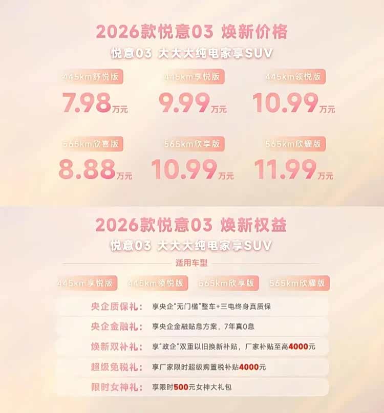 3月8日,2026款一汽 悦意03(参数|询价)正式上市。新车共推出6款车型,指导价区间7.98-11.99万元。作为年度改款车型,2026款一汽悦意03在延续现款产品优势的基础上,重点针对视觉体验与实用配置进行了优化升级。旨在进一步满足家庭用户,尤其是女性用户对出行品质的需求。