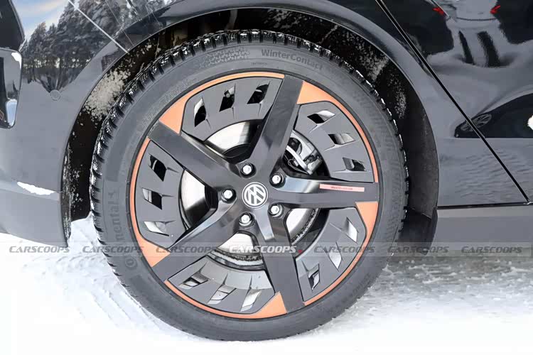 这是一款黑色搭配铜色装饰的轮毂,风格与 Cupra 车型十分接近,尤其酷似同平台的 Cupra Raval 轮毂。但轮毂中心盖带有大众标志,要么是集团零部件共享,要么是大众设计团队直接 “借用” 了这套好看的轮毂。