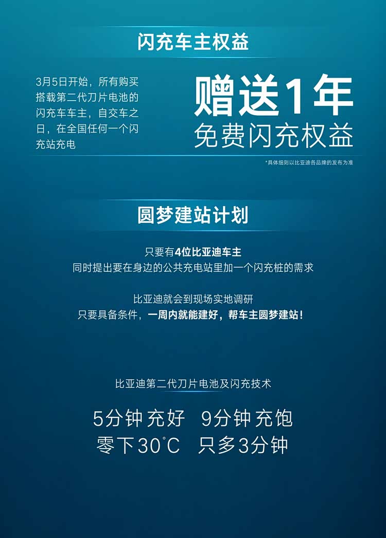 发布会同步释放重磅福利,搭载第二代刀片电池的闪充车主,可享全国闪充站 1 年免费闪充权益,免费期后收费与行业持平,不额外加价。从技术突破到网络布局,从用户权益到生态共建,比亚迪以全栈自研能力,把闪充速度变成全民福利,用技术与诚意推动新能源行业迈入闪充普惠时代。