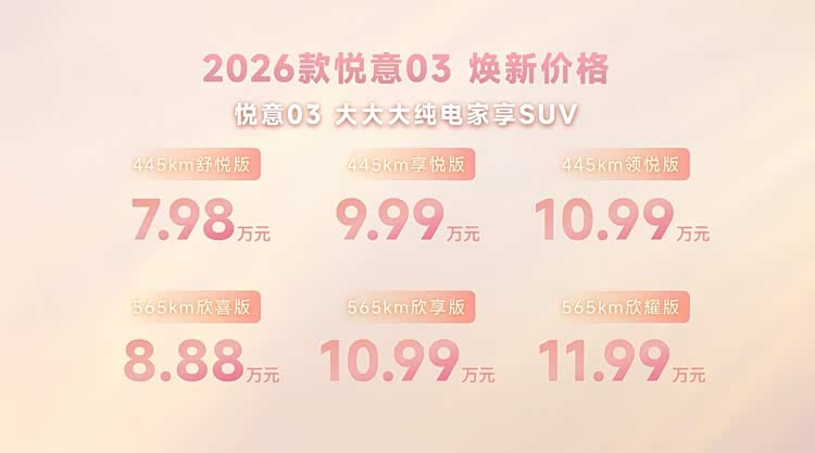 三月春暖,悦见花开。3月8日妇女节,实力演员张若昀直播助阵,“大大大纯电家享SUV”焕新而来,2026款悦意03挚爱上市,为每一位女神献上春天的礼物。445km、565km两种续航共计6款车型,官方售价7.98-11.99万元。围绕年轻小家庭,尤其是家庭女性用户的进阶需求,从颜色推新到舒适满配,2026款悦意03带来全新晨晖金车色、晨曦白内饰色等20余项升级,让用车更舒心、开车更省心、养车更安心,正如张若昀所说:“悦意03是真舒适的纯电SUV。”当前购车还可享7年0息贷款、无门槛整车及三电终身质保等丰富权益,轻松开启高品质纯电生活。