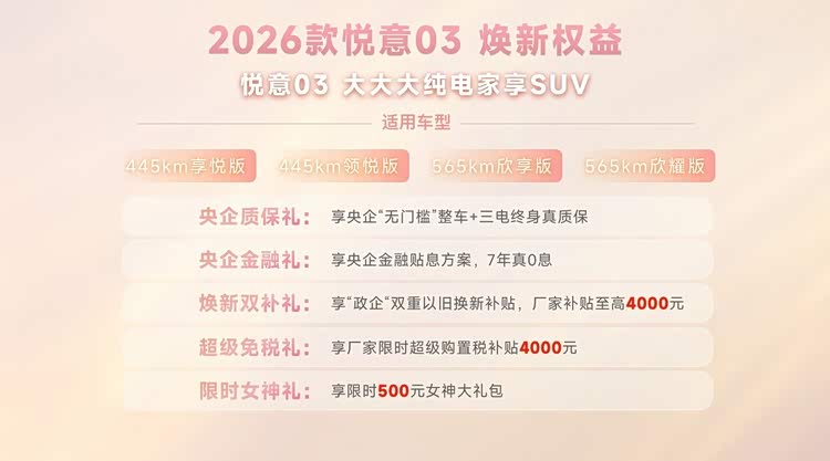 为了让更多家庭轻松拥有这份“悦意”,2026款悦意03还重磅推出央企五重礼遇。购车即享央企质保礼,“无门槛”整车及三电终身质保真诚以待,更有7年真0息央企金融礼,极大降低拥车门槛,同时,新车叠加焕新双补礼,政企双重以旧换新补贴至高4000元,以及限时4000元购置税补贴的超级免税礼、限时500元的开学/开工礼。特别值得一提的是,还有限时半价权益,可升级价值4000元的舒适选装包(具体优惠政策请详询当地经销商)。在这个女神节,让爱与梦想零负担启程。