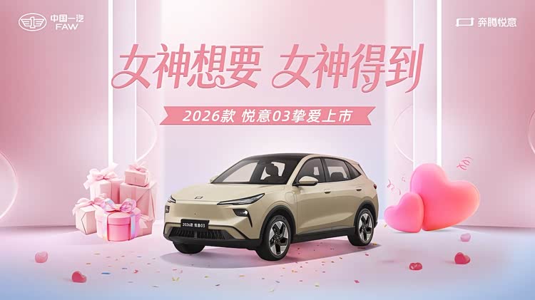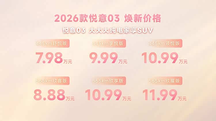 三月春暖,悦见花开。3月8日妇女节,实力演员张若昀直播助阵,“大大大纯电家享SUV”焕新而来,2026款 悦意03(参数|询价)挚爱上市,为每一位女神献上春天的礼物。445km、565km两种续航共计6款车型,官方售价7.98-11.99万元。围绕年轻小家庭,尤其是家庭女性用户的进阶需求,从颜色推新到舒适满配,2026款悦意03带来全新晨晖金车色、晨曦白内饰色等20余项升级,让用车更舒心、开车更省心、养车更安心,正如张若昀所说:“悦意03是真舒适的纯电SUV。”当前购车还可享7年0息贷款、无门槛整车及三电终身质保等丰富权益,轻松开启高品质纯电生活。