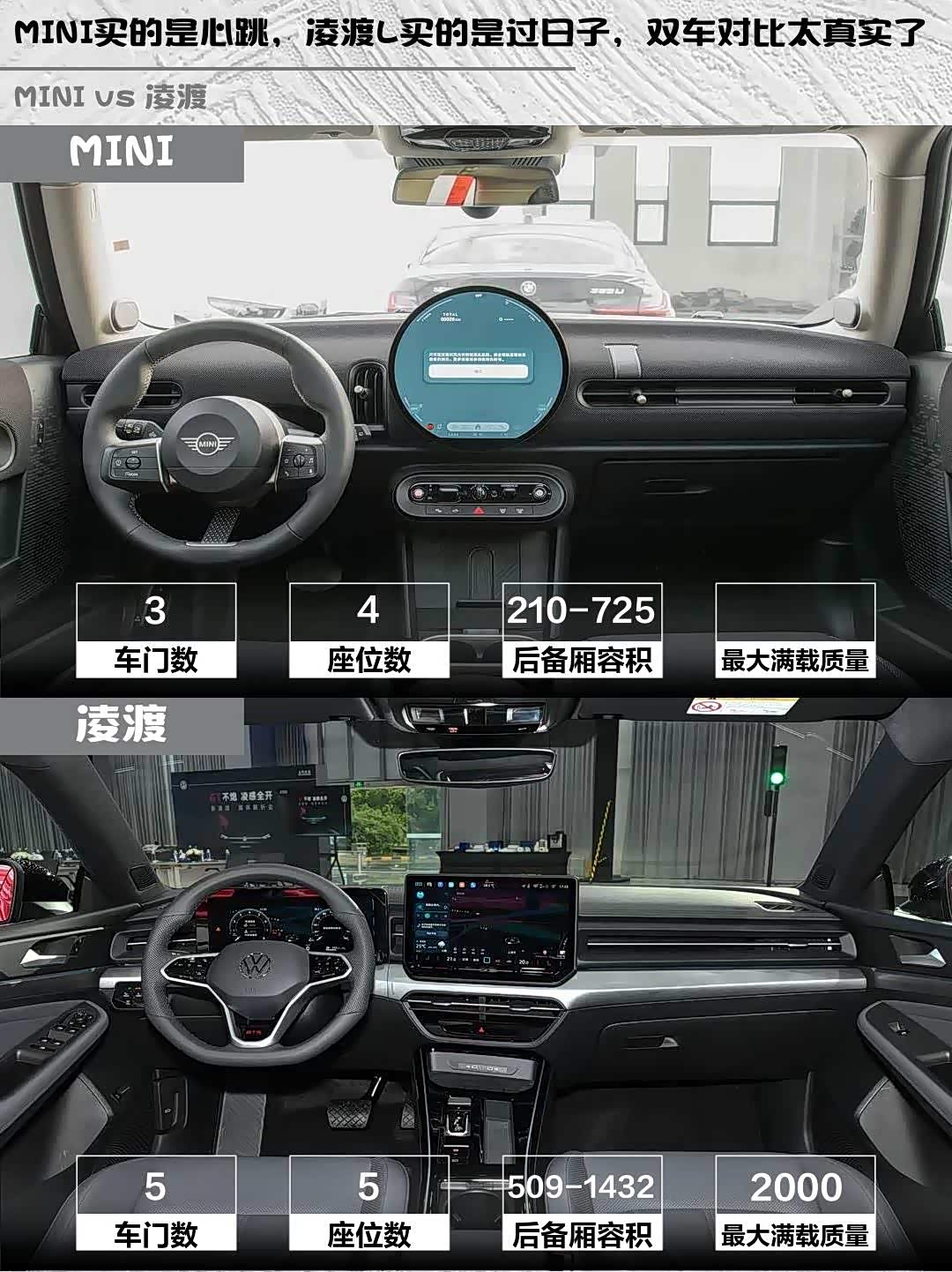 MINI的圆形中控台配9.4英寸触控屏,实体按键够大盲操超顺手!不过后排进出确实要"缩骨功"😂 凌渡L GTS的12.9英寸大屏+电子挡把科技感拉满,509L后备箱还能一键放倒,周末露营装备随便塞。但中控塑料感略强,和外观的炫酷有点反差萌。