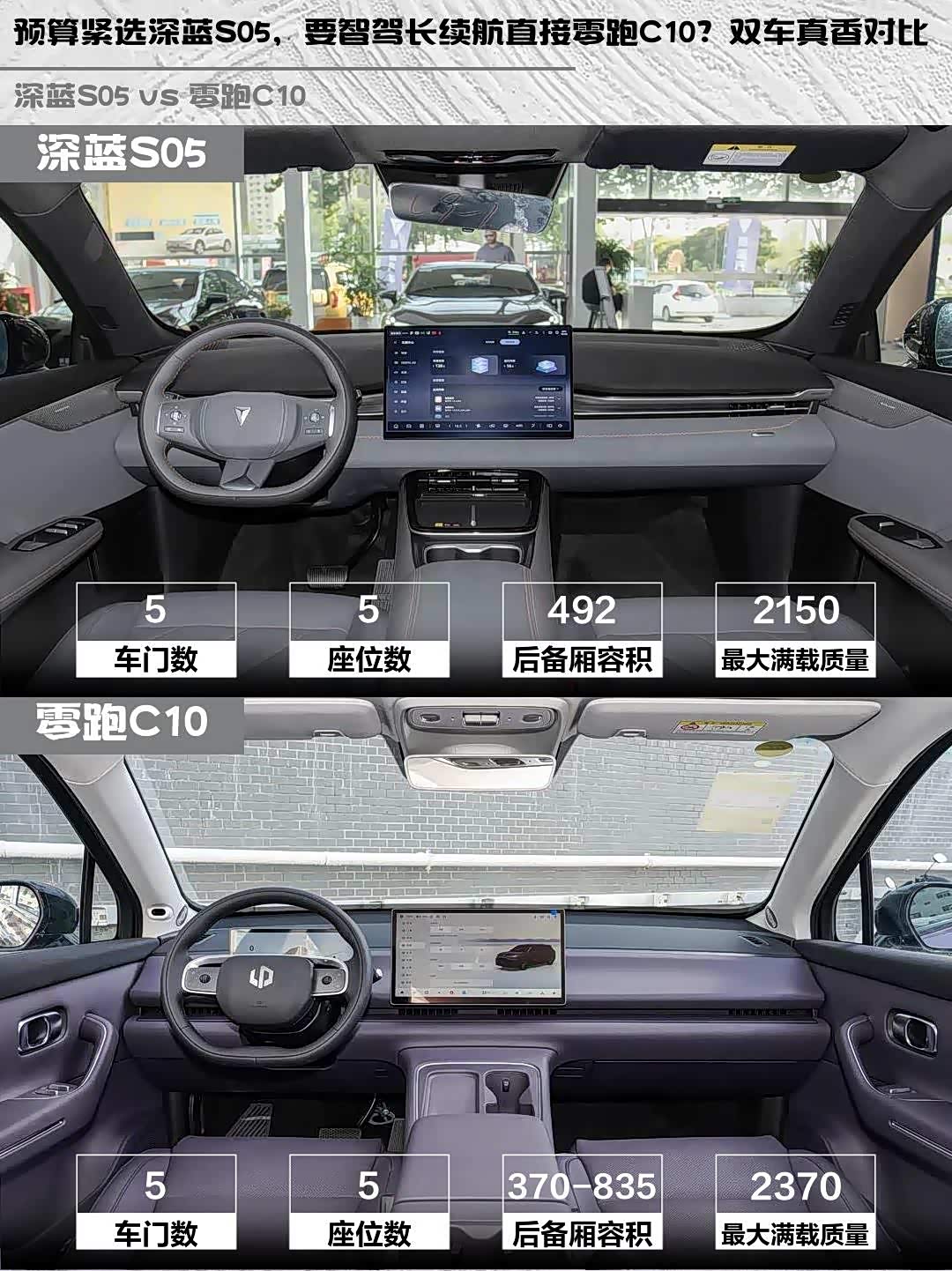 虽然零跑C10定位中型SUV,但深蓝S05的492L后备箱比C10常规状态的370L更能装!后排放倒后都能形成纯平空间,不过深蓝的座椅材质更柔软,长时间乘坐舒适性更好。C10的优势在于后排靠背可调,全家出游时能灵活调整坐姿。