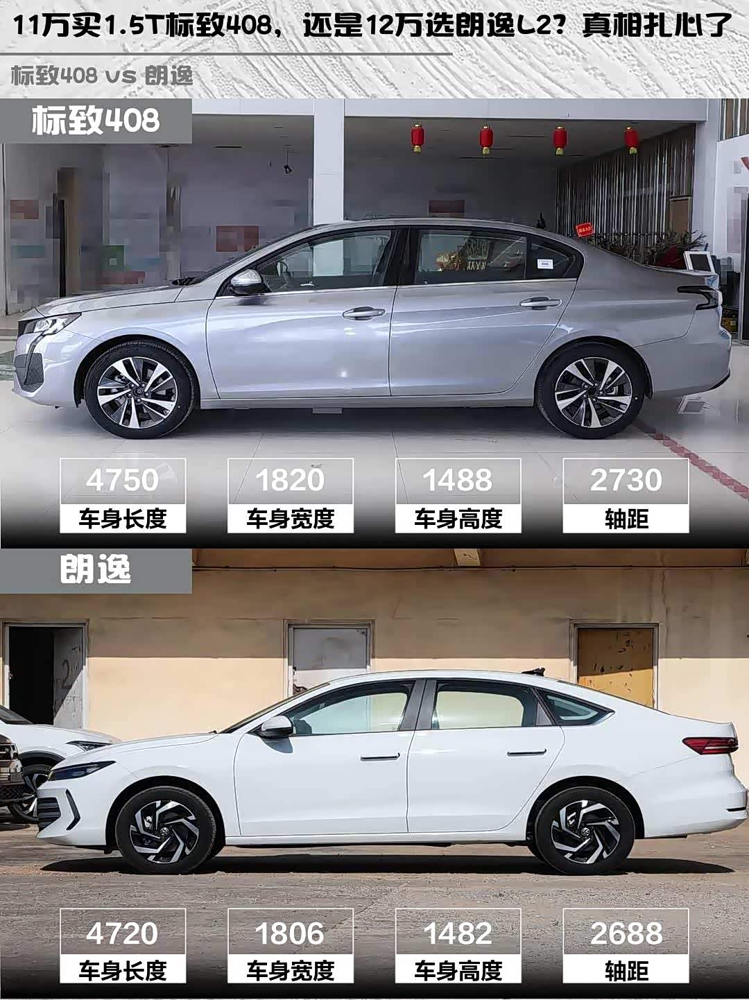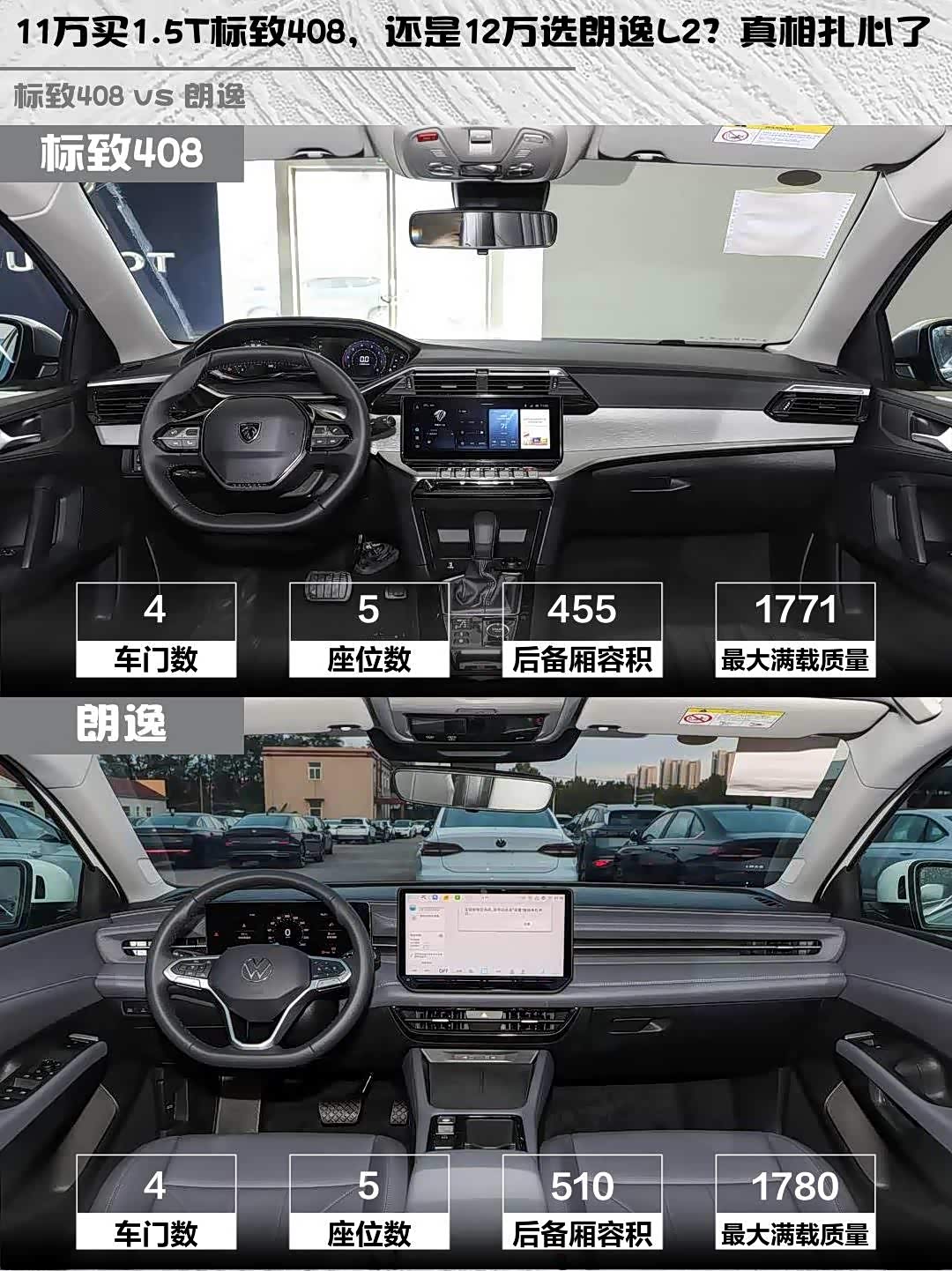 两车都是标准三厢,标致408车身更长(4750mm vs 4720mm),后排腿部空间更充裕。不过朗逸后备箱510L比408的455L能装,过年回老家拉年货更给力。座椅舒适度上408的包裹性更好,朗逸的座椅偏硬但支撑性不错。