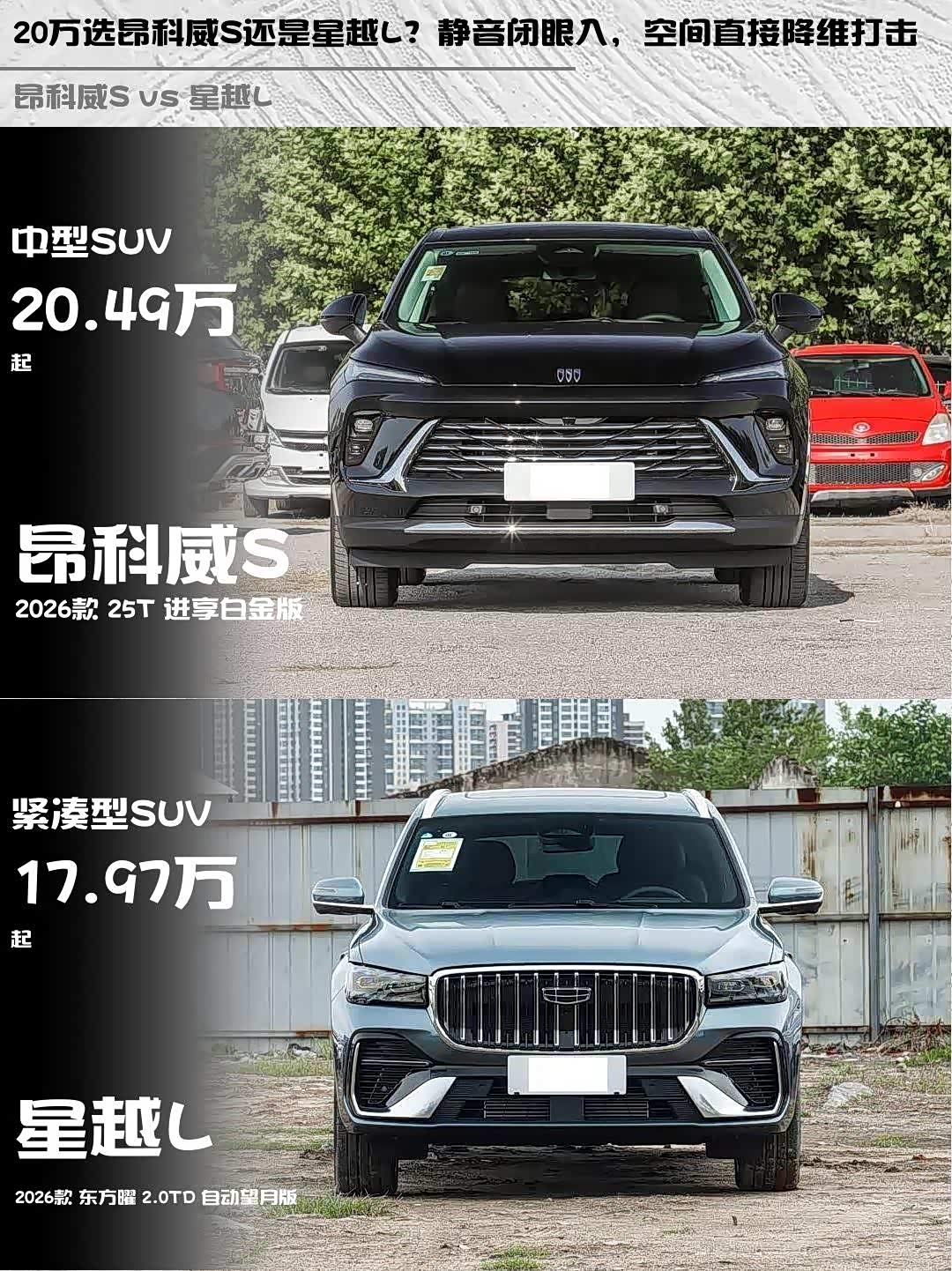 最近在20万级SUV里纠结了好久,最终锁定 昂科威S(参数|询价) 2026款 25T 进享白金版和星越L 2026款 东方曜 2.0TD 自动望月版这两款热门车型。深度试驾后,发现它们完全是两种性格的选手!今天就从真实体验出发,给正在选车的兄弟们一些干货参考~