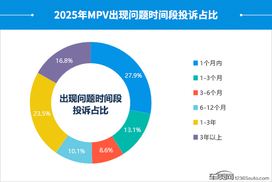 从2025年MPV出现问题时间段统计中可以看出,购车1个月内和1-3年的投诉最为集中,两者占比之和超过总量的五成,并且投诉占比均较2024年有所上升,分别提高了4.8和1.3个百分点。相比之下,购车3年以上的投诉占比出现明显回落,同比下降3.3个百分点。
