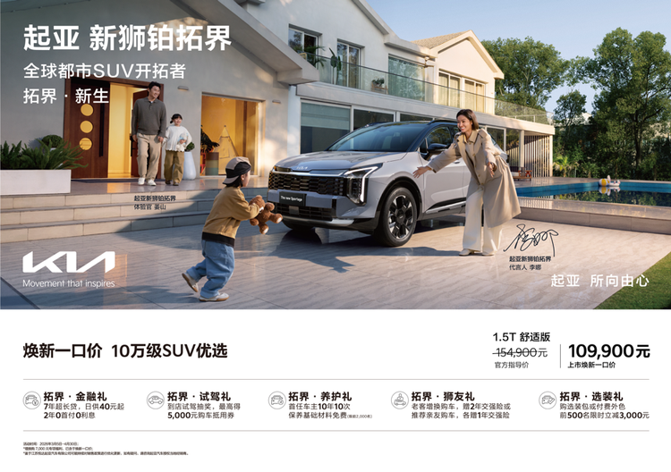经典焕新,传奇再续。2026年3月5日,起亚新 狮铂拓界(参数|询价)正式上市,共推出7款车型,并在中国首次提供X-Line专属运动设计包,官方指导价15.49万元-21.79万元。为回馈广大中国用户的信赖,即日起至4月30日,消费者购车即享全国统一“焕新一口价”10.99万元起!同时还可享金融礼、试驾礼、养护礼、狮友礼、选装礼5大尊享礼遇。