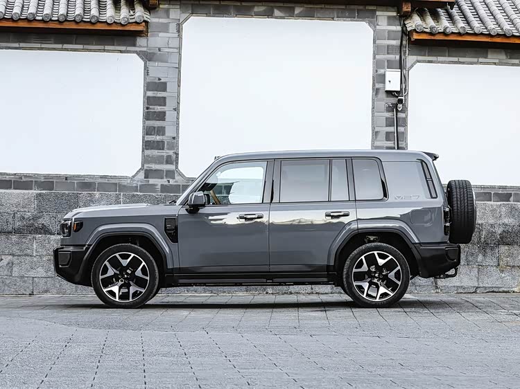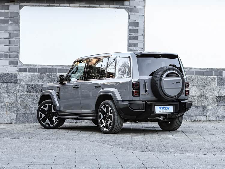 再来看车身侧面部分,iCAR V27延续了纯粹的方盒子设计,平直的车顶与笔直的腰线,勾勒出稳重硬朗的轮廓。接近1:1的宽高比,让整车姿态挺拔有力,气场十足。车身提供两种尺寸版本,常规版车长4909mm,加装外挂式备胎后车长达到5055mm,宽度均为1976mm,高度为1894mm,轴距更是达到2910mm,为车内宽敞空间奠定了基础。粗犷轮眉与大尺寸黑色轮毂,进一步凸显越野属性,265/45R21尺寸的轮胎,既保证了城市道路的行驶舒适性,也能应对轻度越野路况。