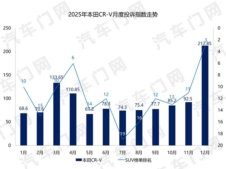 2025年大部分时间里,CR-V的投诉指数都不到100,但3、4月份和年底出现了一小一大两次波动。这两次波动背后,转向异响都成了直接推手。