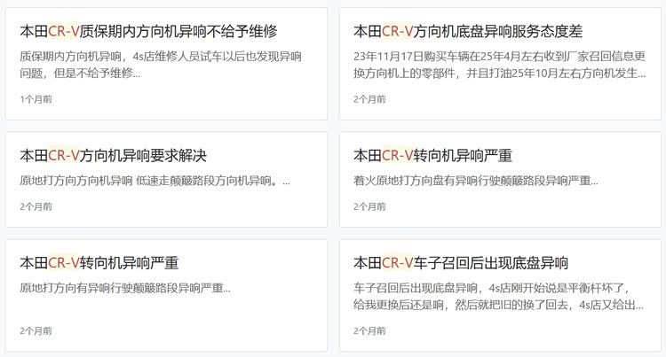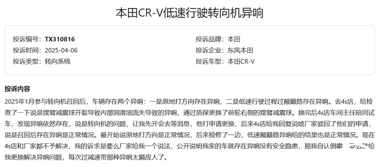 来自西安的车主向汽车门网投诉称,2023年6月购买了一辆本田CR-V 2023款 240TURBO两驱锋尚版5座版。2025年3月,当地本田4S店电话告知,因转向机问题进行召回。到4S店更换转向机弹簧后发现,车辆后转向机异响更加严重,尤其在颠簸路面异响声大的无法驾驶。车主多次与经销商和厂家沟通,但经销商与厂家相互推诿扯皮,问题一直未得到处理。