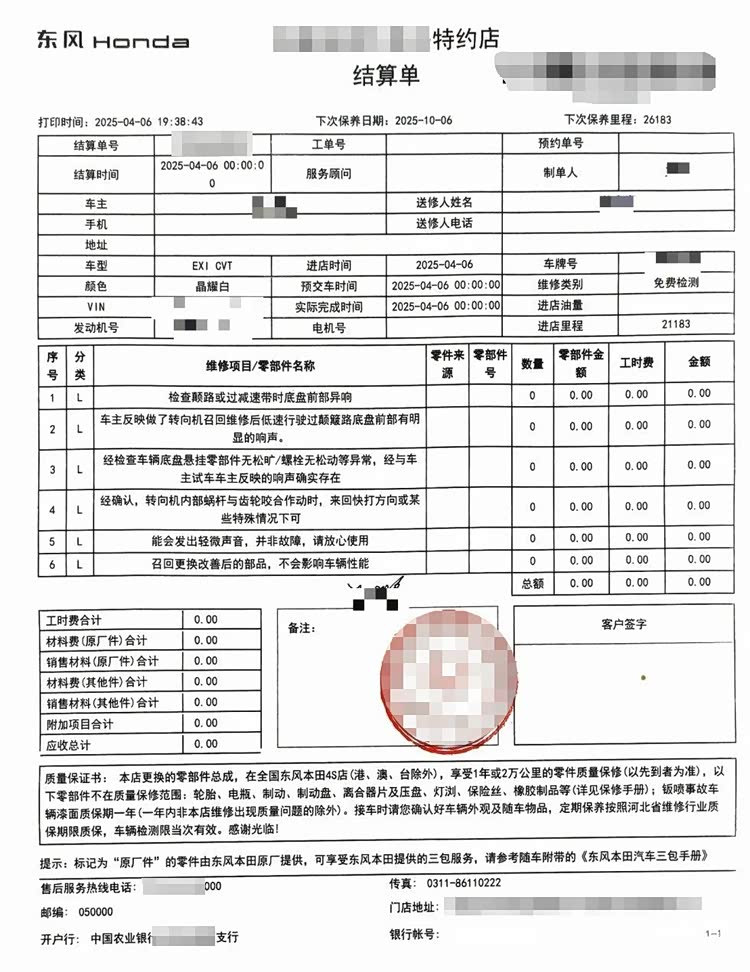 另有车主表示,4S店向其告知,异响是召回后的通病,解决不了。其前往维修的东风本田经销商工单标注:“经确认,转向机内部蜗杆与齿轮咬合作动时,来回快打方向或某些特殊情况下可能会发出轻微声音,并非故障,请放心使用,召回更换改善后的部品,不会影响车辆性能”。
