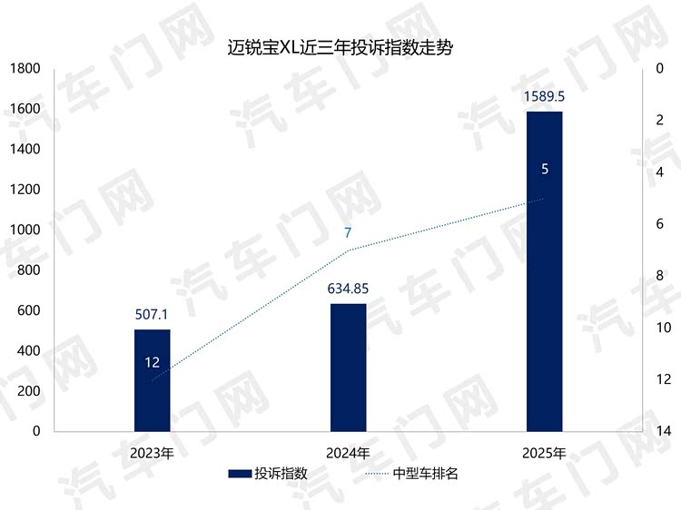 过去几年来, 迈锐宝XL(参数|询价)的投诉指数经历了两次大规模增长。2023年全年,迈锐宝XL的投诉指数由2022年的114.1暴增至507.1。2025年,迈锐宝XL迎来了又一次投诉潮,全年整体投诉指数达到了1589.5,同比大涨了150%。
