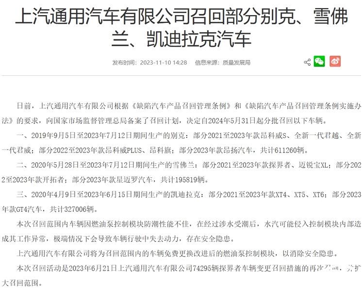2023年11月,上汽通用汽车有限公司发布召回公告。2024年5月31日起,上汽通用将分批召回2020年5月28日至2023年7月12日期间生产的部分雪佛兰探界者、迈锐宝XL等车型,共计195819辆。
