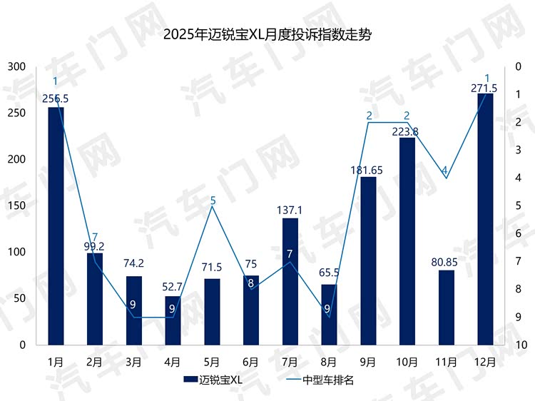 总的来看,2025年,迈锐宝XL的投诉指数波动较大,全年出现了至少三次大的波动。1月份,迈锐宝的投诉指数达到了256.5。变速箱无法挂入P挡、高位刹车灯开裂和燃油泵模块故障三大问题共同将迈锐宝XL推向了中型车投诉榜首。此后的7月,9、10月和12月,迈锐宝XL投诉指数的每一次升高,背后都有上述一个或几个问题“作祟”。