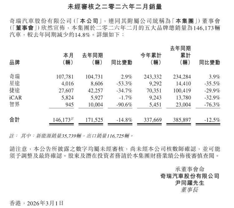 官方数据显示,2026年2月,星途品牌单月销量仅为4016台,相较去年同期遭遇了53.3% 的断崖式下滑。