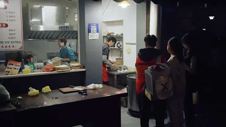 就一个男性师傅在忙活,手速飞快,风急火燎的快,在节能灯照耀下几乎可以看到运动残影。他问我们要什么饼,语速也飞快,我稍有犹豫思考,大哥就很不耐烦,喊我快点决定,否则就要先做后面人的饼了... 我匆忙下单,带着情绪扫码付款,一肚子不爽。