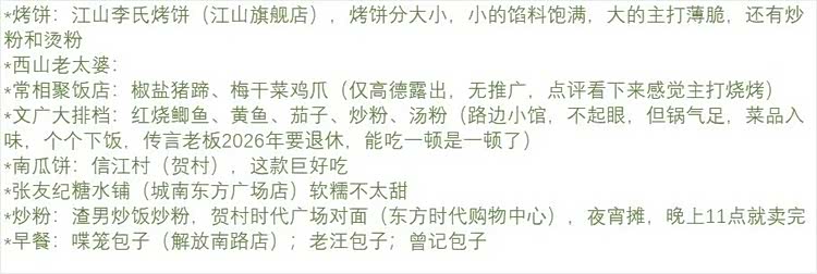 可惜,每个城市没有太多时间逗留,很多东西都没机会去品尝,只能尽力而为,留些念想以后再来了(上图,是我总结的江山美食功课,献丑了,欢迎当地诺粉劈砖)。