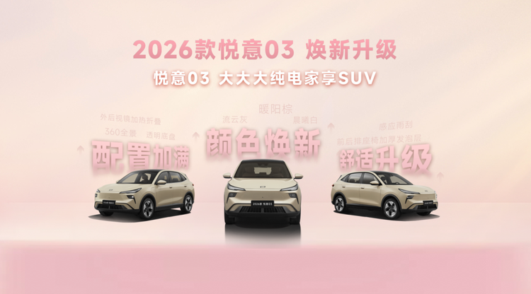 2026款悦意03以家庭用户的实际用车需求为核心,通过20余项升级实现产品力的提升,依托高性价比的定价与丰富的购车权益,为年轻小家庭提供了高品质的纯电出行选择。
