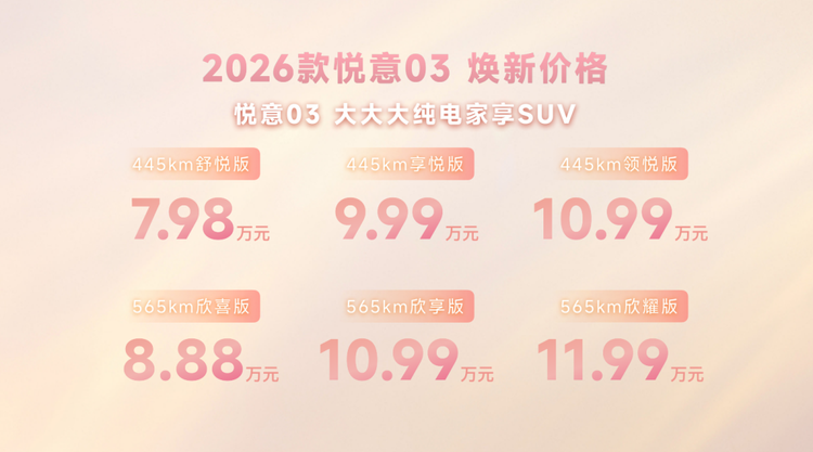 3月8日,2026款 悦意03(参数|询价)正式上市,新车推出445km、565km两种续航版本共6款车型,官方指导价7.98-11.99万元。