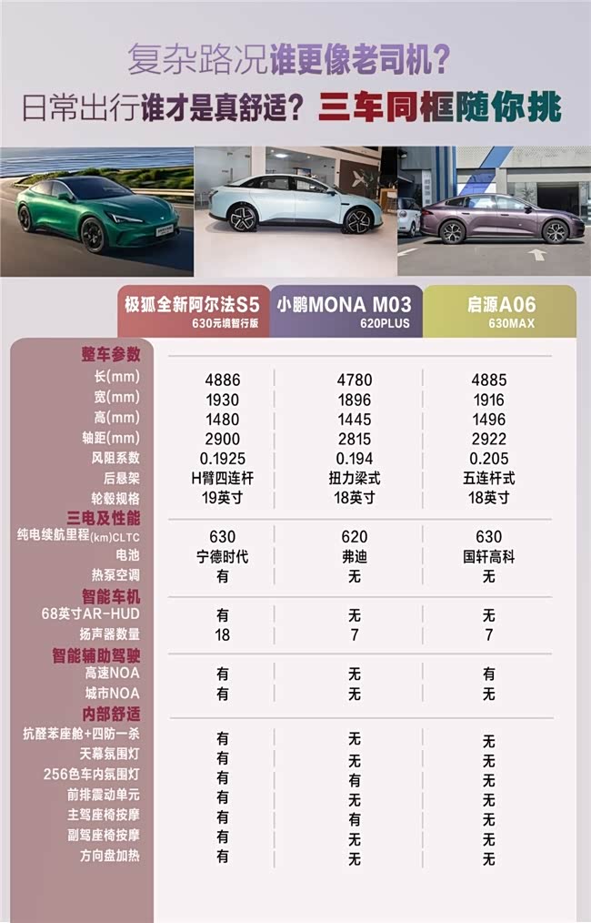 先从整车基础参数说起,这是车辆实用性的直观体现。极狐全新阿尔法 S5 车长 4886mm、宽 1930mm、高 1480mm,轴距 2900mm;小鹏 MONA M03 车长 4780mm、宽 1896mm、高 1445mm,轴距 2815mm;启源 A06 车长 4885mm、宽 1916mm、高 1496mm,轴距 2922mm。从尺寸数据来看,极狐全新阿尔法 S5 的车长和车宽在三款车型中更占优,配合深空星穹大溜背设计,既保持了轿跑的动感姿态,又能为车内带来更宽敞的横向乘坐空间;启源 A06 轴距略长,车高更突出,纵向头部空间会更宽裕;小鹏 MONA M03 车身更小巧,在城市拥堵路段和停车时会更灵活。风阻系数方面,极狐全新阿尔法 S5 为 0.1925Cd,小鹏 MONA M03 为 0.194Cd,启源 A06 为 0.205Cd,更低的风阻能有效降低高速行驶时的能耗,同时提升车内静谧性,极狐全新阿尔法 S5 在空气动力学设计上的表现更亮眼。后悬架配置上,极狐全新阿尔法 S5 采用 H 臂四连杆,启源 A06 为五连杆式,小鹏 MONA M03 为扭力梁式,多连杆结构在滤震和操控稳定性上更具优势,适合追求驾驶质感的用户。
