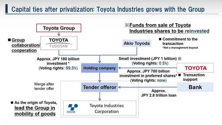 在最终形式中,丰田Fudosan将在完全拥有丰田织机的控股公司中拥有99.5%的投票权。丰田章男将持有0.5%的投票权。丰田汽车的持股将是无投票权的股份。