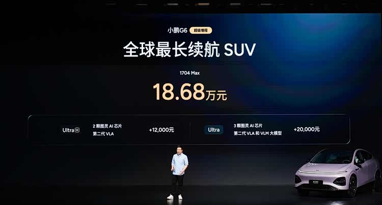 今日,小鹏汽车举行小鹏G6超级增程上市发布会,新车定位六项全能AI增程SUV,以“六项全能 一步到位”为核心,凭借同级综合续航第一、同级补能速度第一、同级车端有效算力第一、同级最强底盘系统、同级最强主动安全和同级得房率第一的六大核心优势,打造真正满足用户全场景需求的国民车。本次发布小鹏G6超级增程1704 Max,官方指导价为18.68万元,用户可选装两个智能升级包,加购12,000元升级为Ultra SE版本、加购20,000元升级为Ultra版本。即日起至2026年3月31日24点前下定小鹏G6超级增程,可享至高价值33,200元限时权益礼包,包括5,000元新春购车补贴、至高价值9,300元金融/选装基金(二选一)、至高价值5,000元置换权益、至高价值13,500元复购权益和价值400元交付礼。