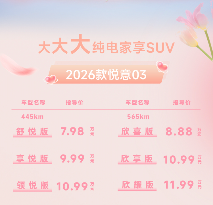 3月8日妇女节,实力演员张若昀直播助阵,“大大大纯电家享SUV”焕新而来,2026款 悦意03(参数|询价)挚爱上市,提供445km、565km两种续航,共6款车型,官方售价7.98-11.99万元。当前购车还可享7年0息贷款、无门槛整车及三电终身质保等丰富权益,轻松开启高品质纯电生活。