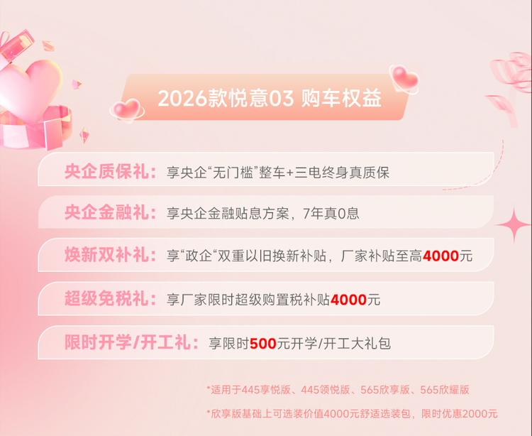 为了让更多家庭轻松拥有这份“悦意”,2026款悦意03还重磅推出央企五重礼遇。购车即享央企质保礼,“无门槛”整车及三电终身质保真诚以待,更有7年真0息央企金融礼,极大降低拥车门槛,同时,新车叠加焕新双补礼,政企双重以旧换新补贴至高4000元,以及限时4000元购置税补贴的超级免税礼、限时500元的开学/开工礼。特别值得一提的是,还有限时半价权益,可升级价值4000元的舒适选装包(具体优惠政策请详询当地经销商)。在这个女神节,让爱与梦想零负担启程。