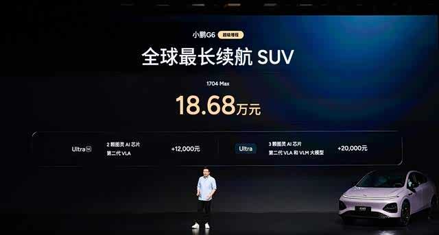 (2026年3月6日,广州)今日,小鹏汽车举行小鹏G6超级增程上市发布会,新车定位六项全能AI增程SUV,以“六项全能 一步到位”为核心,凭借同级综合续航第一、同级补能速度第一、同级车端有效算力第一、同级最强底盘系统、同级最强主动安全和同级得房率第一的六大核心优势,打造真正满足用户全场景需求的国民车。本次发布小鹏G6超级增程1704 Max,官方指导价为18.68万元,用户可选装两个智能升级包,加购12,000元升级为Ultra SE版本、加购20,000元升级为Ultra版本。即日起至2026年3月31日24点前下定小鹏G6超级增程,可享至高价值33,200元限时权益礼包,包括5,000元新春购车补贴、至高价值9,300元金融/选装基金(二选一)、至高价值5,000元置换权益、至高价值13,500元复购权益和价值400元交付礼。