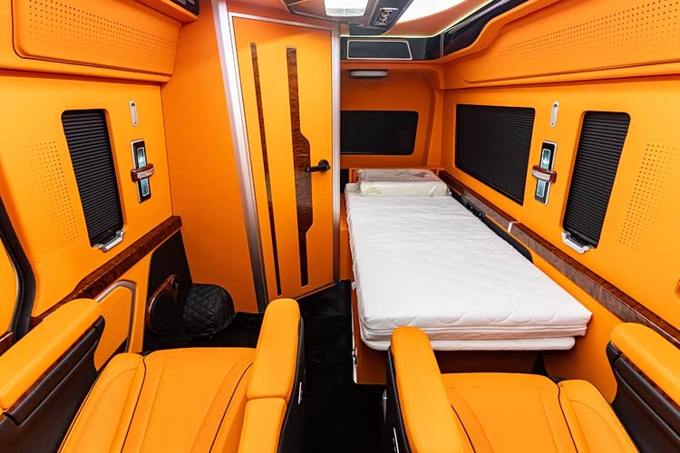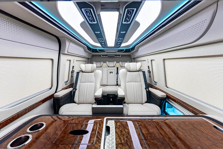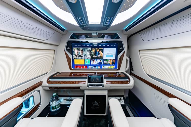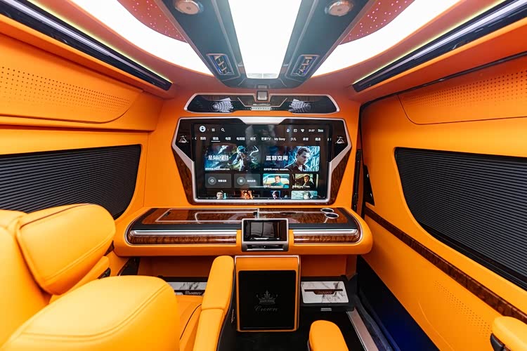 内饰采用高端真皮包覆,搭配实木饰条与氛围灯,豪华感拉满。车载电视、无线充电、多区独立空调、隐私窗帘等配置一应俱全,无论是家庭出行、商务接待、企业通勤还是高端接送,都能轻松胜任。