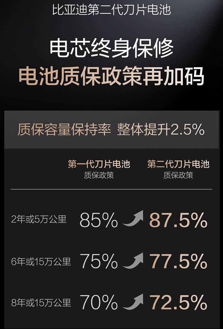 底气足,质保更硬核。相比第一代,第二代刀片电池寿命进一步提升,容量保持率质保提升2.5%,容量低于77.5%免费包换,电芯依旧终身保修,用政策给用户实打实的安心。