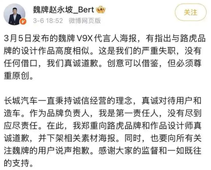 随后,他向路虎揽胜、原设计师及广大网友郑重道歉。魏牌负责人赵永坡,也发微博道歉。