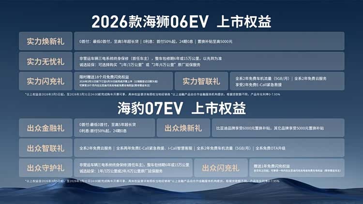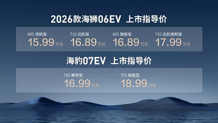 其中,2026款海狮06EV官方指导价格区间为15.99万元-17.99万元,同步推出实力焕新礼、实力无忧礼、实力闪充礼、实力智联礼等多重购车福利;海豹07EV官方指导价设定为16.99万元-18.99万元,自发布之日起,用户可享受出众金融礼、出众焕新礼、出众智联礼、出众守护礼、出众闪充礼等多项专属礼遇。
