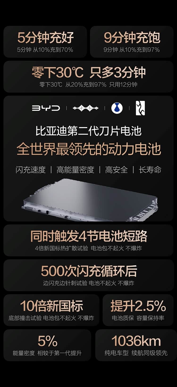 就拿第二代刀片电池来说,它做到了5分钟充好,9分钟充饱,也就是在常温状态下,仅5分钟就可以将电量从10%充至70%,9分钟就可以将电量从10%充至97%,在零下30多度的情况下仅多出3分钟时间,可见二代刀片电池的充电效率有多么高。说白了,开着比亚迪二代刀片电池的车出行,它的补能效率比燃油车还要高,长途出行的时候,去服务区先充上电,然后买一杯咖啡的时间,这边都已经为你充满电了,补能的时候它完全不会占用你的精力,出行效率大幅提高。