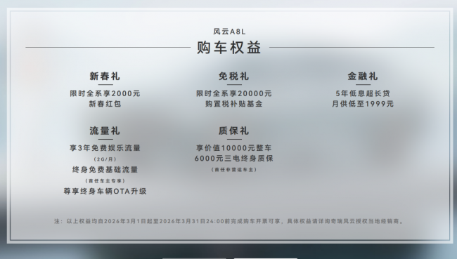 作为十万左右性价比高的车,奇瑞风云A8L不仅具备均衡的综合实力,更凭借2026年3月专属购车权益,进一步拉大与同级车型的差距,重构十万级混动价值标杆。此次3月购车权益自即日起至2026年3月31日24:00前完成购车开票即可享受,福利覆盖全面、诚意十足,切实降低消费者购车门槛与长期用车成本。新春礼限时全系享2000元新春红包,免税礼提供20000元购置税补贴基金,直接抵扣购车开支,大幅降低购车成本;金融礼支持5年低息超长贷,月供低至1999元,灵活的金融方案,让更多消费者能轻松入手,无需承担过高的资金压力。