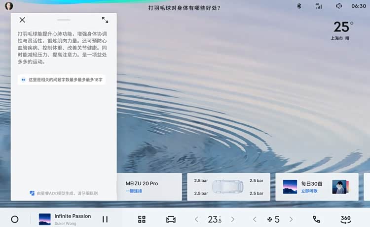 沉浸式影音系统堪称移动影院,车内搭载16扬声器音响系统与QQ音乐FlymeSound专区,“臻品全景声7.1”模式精准还原立体环绕音效,无论是激昂的摇滚乐还是细腻的古典乐,都能带来身临其境的听觉盛宴。256色智能悦动氛围灯可随音乐节奏变换色彩,配合采光面积达0.85㎡的可开启全景天窗,白天沐浴暖阳,夜晚光影流转,日常通勤也能充满仪式感。