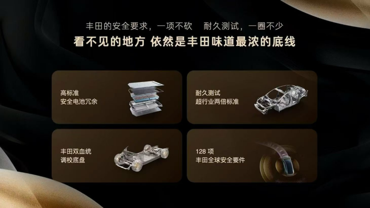 丰田式安全和耐久的底线思维,以“安心”为初心,在看得见和看不见的地方坚持高标准。智驾植入14项安全要件,电池挑战电芯锯切实验,空悬测试904万次,门把手设计提前满足新国标。